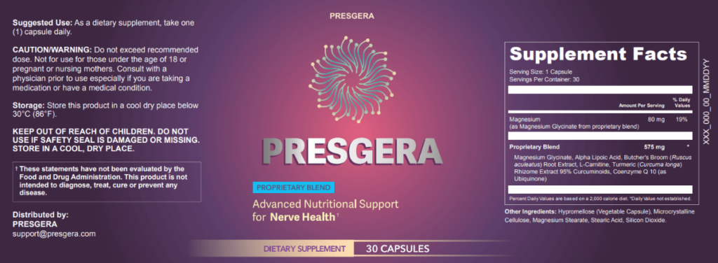 Each capsule of Presgera is carefully formulated with high-quality components designed to ensure stability, absorption, and consistent delivery of its active compounds for daily nerve health support.